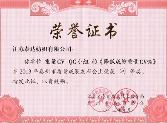 同時,公司QC小組攜此課題參加了2013年“泰州移動杯”QC小組質(zhì)量成果大賽并最終入選。2013年9月26日,泰州市質(zhì)量技術(shù)監(jiān)督局特邀有關(guān)領(lǐng)導(dǎo)和專家擔(dān)任評委,對各企業(yè)入選成果進行評審。最終,我公司“降低成紗重量CV%”QC小組榮獲二等獎,這是姜堰區(qū)入選企業(yè)榮獲的最高名次,亦是泰州全市、區(qū)范圍內(nèi)紡織企業(yè)獲獎的最高名次。